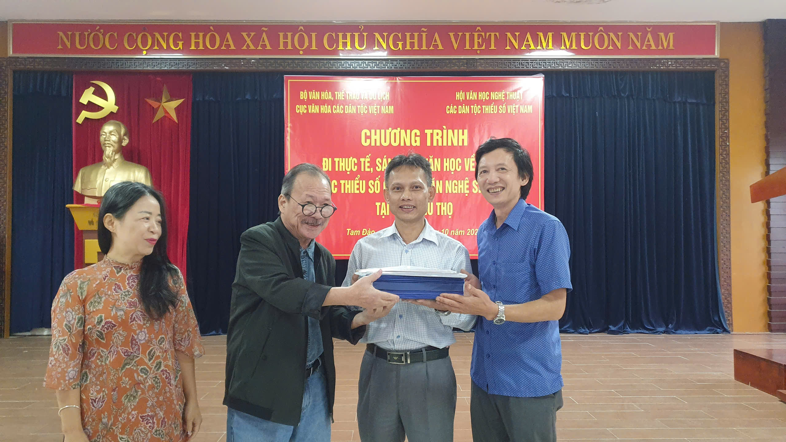 Nhạc sĩ Nông Quốc Bình (thứ hai từ trái sang) – Chủ tịch Hội Văn học nghệ thuật các dân tộc thiểu số Việt Nam và ông Đỗ Quang Trung (ngoài cùng bên phải) – Giám đốc Nhà sáng tác khu vực miền Bắc nhận 152 tác phẩm thu được từ Trại sáng tác.