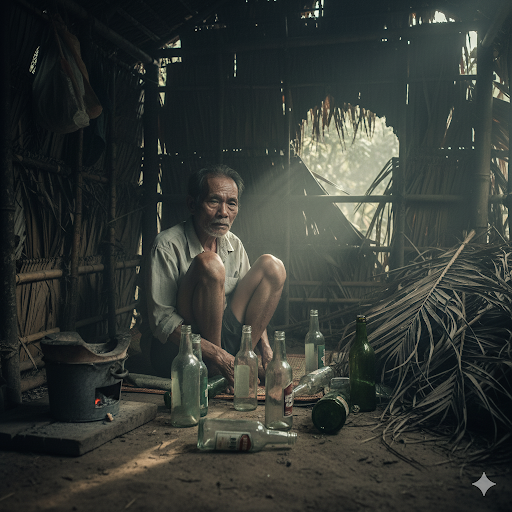 Cuộc sống không tiền, không gạo, người ông lúc nào cũng cồn cào, thơ thẩn, ông thường ăn rau dại, chuối nấu để cầm hơi, lúc nào khỏe thì ra bờ sông mò hến, có khi đói quá ông chỉ uống đỡ ngụm nước mưa rồi ngủ đi lúc nào không hay. Tỉnh dậy sau những lần như vậy, ông tự hỏi làm gì để sống, bây giờ chẳng lẽ đi ăn trộm. Trước đây, nghe câu “bần cùng sinh đạo tặc” ông rất dị ứng. Nhưng trong hoàn cảnh này, có lẽ ông cũng không thể làm khác vì không có rượu ông như cái xác chết di động, cơn thèm rượu cứ thôi thúc ông làm một cái gì đó. Nhưng ông phải làm gì đây? Ý nghĩ đó cứ lẩn quẩn trong đầu. Bỗng “hú.….” tiếng chó gần đó vang lên làm ông giật mình. Chó, phải rồi, chó! Ông lẩm nhẩm trong miệng như vậy. Mấy bữa gần đây, lũ chó hoang cứ hay tới lui căn chòi của ông, thậm chí vô tận bên trong lục tung mọi thứ để kiếm ăn. Nhiều lần ông đã xua đuổi, lấy củi chọi thẳng tay nhưng chúng vẫn cứ thản nhiên như không, thậm chí còn thách thức khi cứ sủa lên ỏm tỏi. Được rồi, tao sẽ cho chúng mày vô quán nhậu hết. Thế là ông nghĩ đến chiếc bẫy chó. Nhưng khi ý nghĩ ấy vừa lóe lên ông lại từ bỏ ngay. Ông thấy mình hèn quá, không ngờ cũng có ngày mình làm cái nghề này sao. Ông đã căm ghét cái nghề mạt hạng này, mà nay thì… Ông thấy mình không đáng mặt đàn ông nữa, thấy xấu hổ với vợ con, với mọi người và với cả con mực. Vợ ông sẽ nghĩ gì, thằng Tý sẽ coi ông ra gì nếu biết ông đi bẫy chó, kể cả con mực cũng xem thường ông vì ông đã từng căm ghét thằng Cu Đen khi nó làm cái nghề này. Vậy là ông tạm gác lại ý định xấu xa của mình…