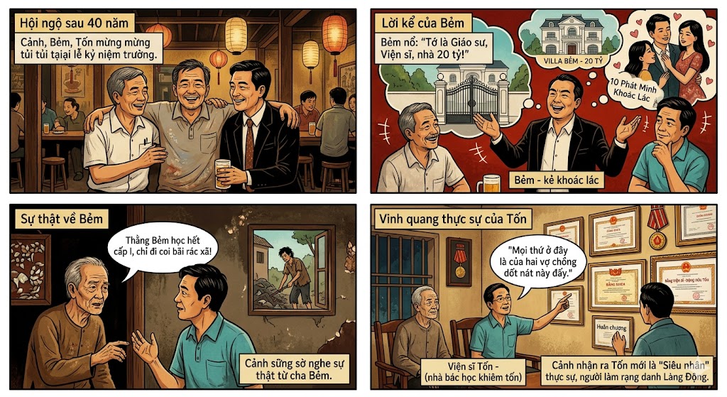 - Em chào anh – Đời khá phức tạp, phải dò cho đến ngọn nguồn lạch sông mới rõ hư thực. Nghĩ vậy, tôi đến nhà cậu Tốn. Bố mẹ Tốn không còn, chỉ gặp anh cả tên Khiêm. Xong lời chào, tôi đưa mắt nhìn bao quát phòng khách. Xem, tôi cứ giật mình liên tục. Bản thân không tin vào mắt mình nữa. Trên tường lồng trong gương toàn là huân, huy chương, bằng khen của hai người: Viện sĩ Đặng Hữu Tốn và Giáo sư Lê Thị Thanh Hoa! Tổng cộng xấp xỉ trên bảy mươi tấm. Hai con người trình độ “vở lòng” và “tốt nghiệp lớp 1” – lời nói thì tự hạ thấp, bôi nhọ mình – mà thực tế có công trạng được tôn danh như thế này sao? Chính trong giây phút này, trong đầu tôi mọi sự mới vỡ lẽ ra, bị đảo lộn hoàn toàn…