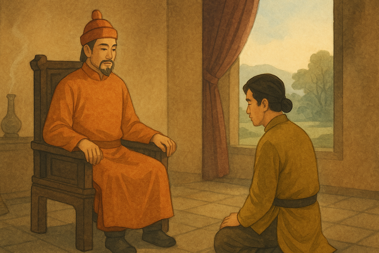 Trong căn thư phòng tĩnh mịch, trầm hương thoang thoảng, Lý Thánh Tông ngồi trên ngai vàng. Ánh sáng từ ô cửa sổ hắt vào, chiếu rõ khuôn mặt nhà vua, không còn sự nghiêm nghị của một bậc đế vương, mà là vẻ đăm chiêu của một người đang kiếm tìm. Trước mặt ngài, Ngô Tuấn quỳ gối, đầu cúi thấp, chờ đợi.