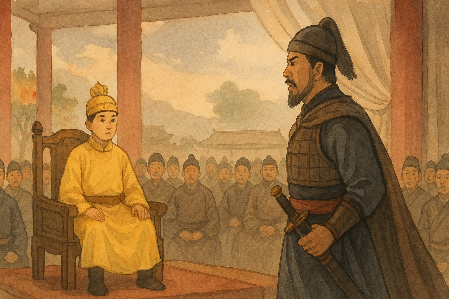 – Bẩm… Thái úy! – Một vị quan già, tóc đã bạc phơ, run rẩy bước ra khỏi hàng. Giọng ông khàn đặc, yếu ớt – Bệ hạ còn quá nhỏ, nếu Thái hậu không thể cai quản, e rằng triều đình sẽ gặp loạn.