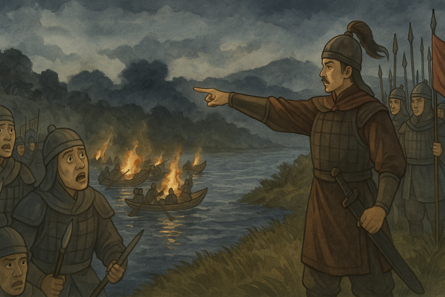 Nhưng rồi, một màn mưa lửa bất ngờ trút xuống. Hàng ngàn mũi tên tẩm dầu, những con đom đóm lửa chết chóc, bay vút qua sông. Chúng lao xuống, châm vào những chiếc thuyền, biến chúng thành những ngọn đuốc khổng lồ bập bùng trên mặt nước. Tiếng la hét, tiếng đổ vỡ vang vọng khắp một vùng trời. Màn dạo đầu đầy kịch tính này khiến Quách Quỳ tỉnh mộng nhận ra rằng, đây không phải là một chiến thắng dễ dàng.