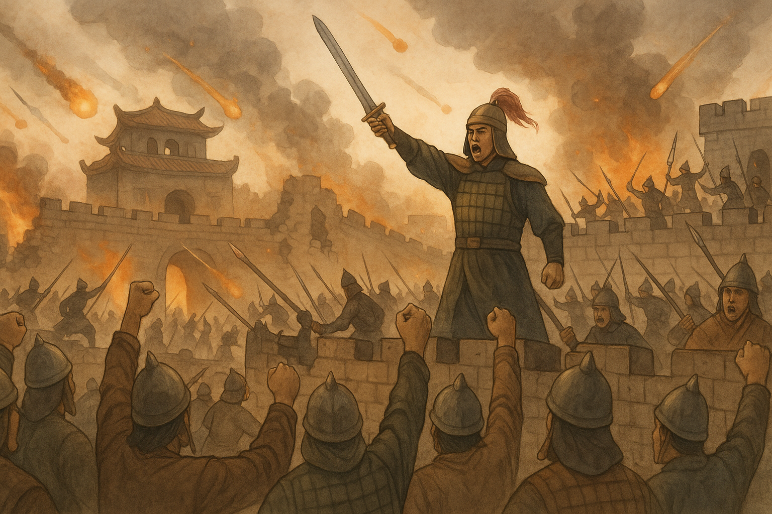 Đột ngột, ông giơ tay ra hiệu. Hàng ngàn ngọn đuốc được châm lên, sáng rực cả một vùng trời, phá tan màn đêm tĩnh mịch. Tiếng trống trận vang lên, dồn dập, mạnh mẽ, như tiếng sấm nổ trời.