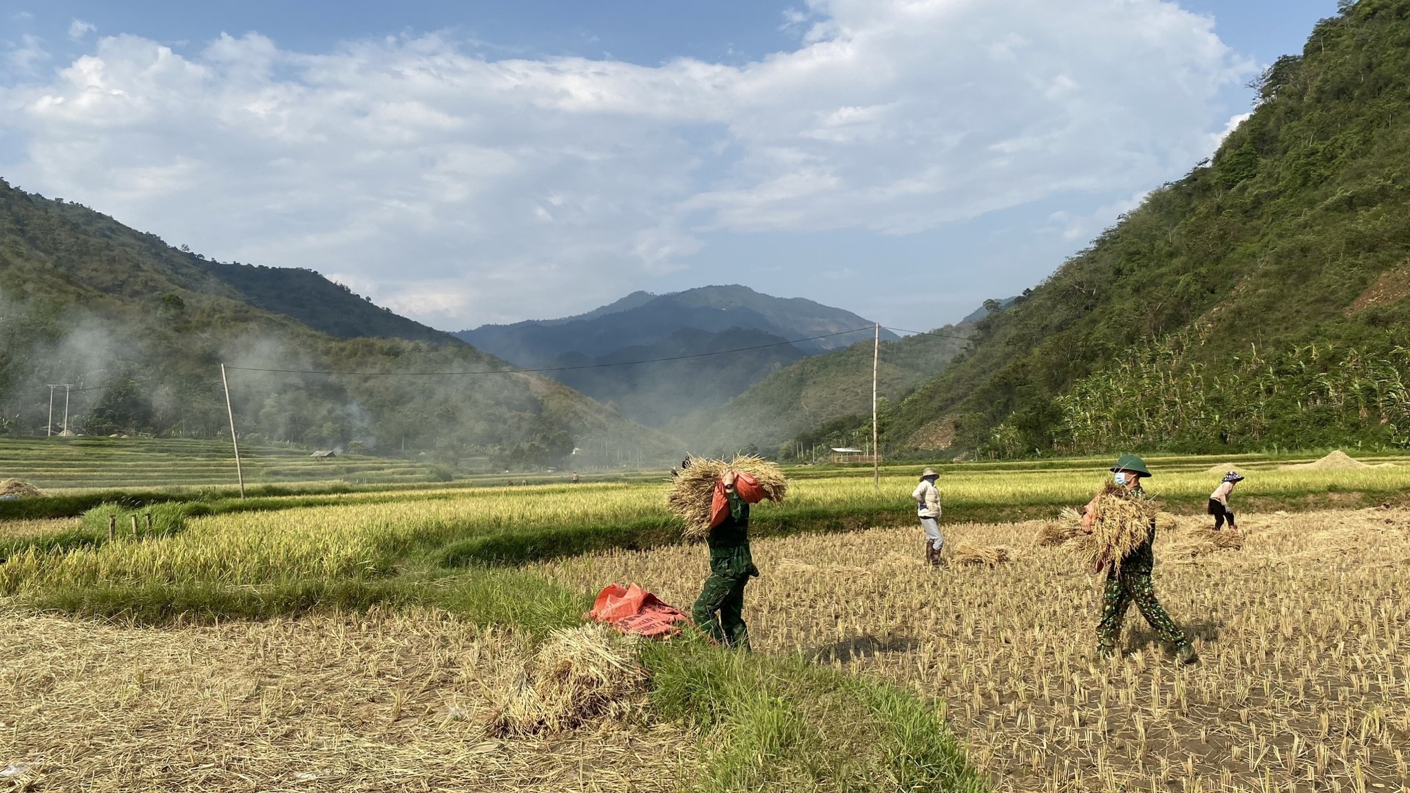 Cán bộ chiến sĩ đồn Tam Chung giúp dân gặt