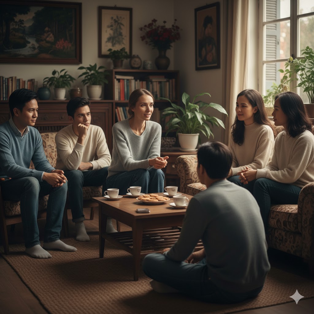 Chúng ở trong nam bảy năm trời, mới về quê cách đây dăm tháng, mang theo hai đứa con nhỏ.Ông bà Tần vui lắm, đón con cháu về ở chung, nhưng cũng chỉ được vài tháng, cha con lại xung đột vì những việc rất không đâu. Tòng lại một lần nữa dắt vợ con ra khỏi nhà – Chị Phin nhận xét. Ông bà ấy đến lạ, ghét con trai, song còn các cháu. Thương cháu phải tạo điều kiện cho dâu nuôi con chứ. Mình đã già rồi. Chuyện của chúng kệ chúng lo. Mọi người trong nhà phải biết nhường nhịn, chấp nhận nhau, mới có thể vui vẻ phấn chấn tạo đòan kết trong gia đình để cùng chung sống.