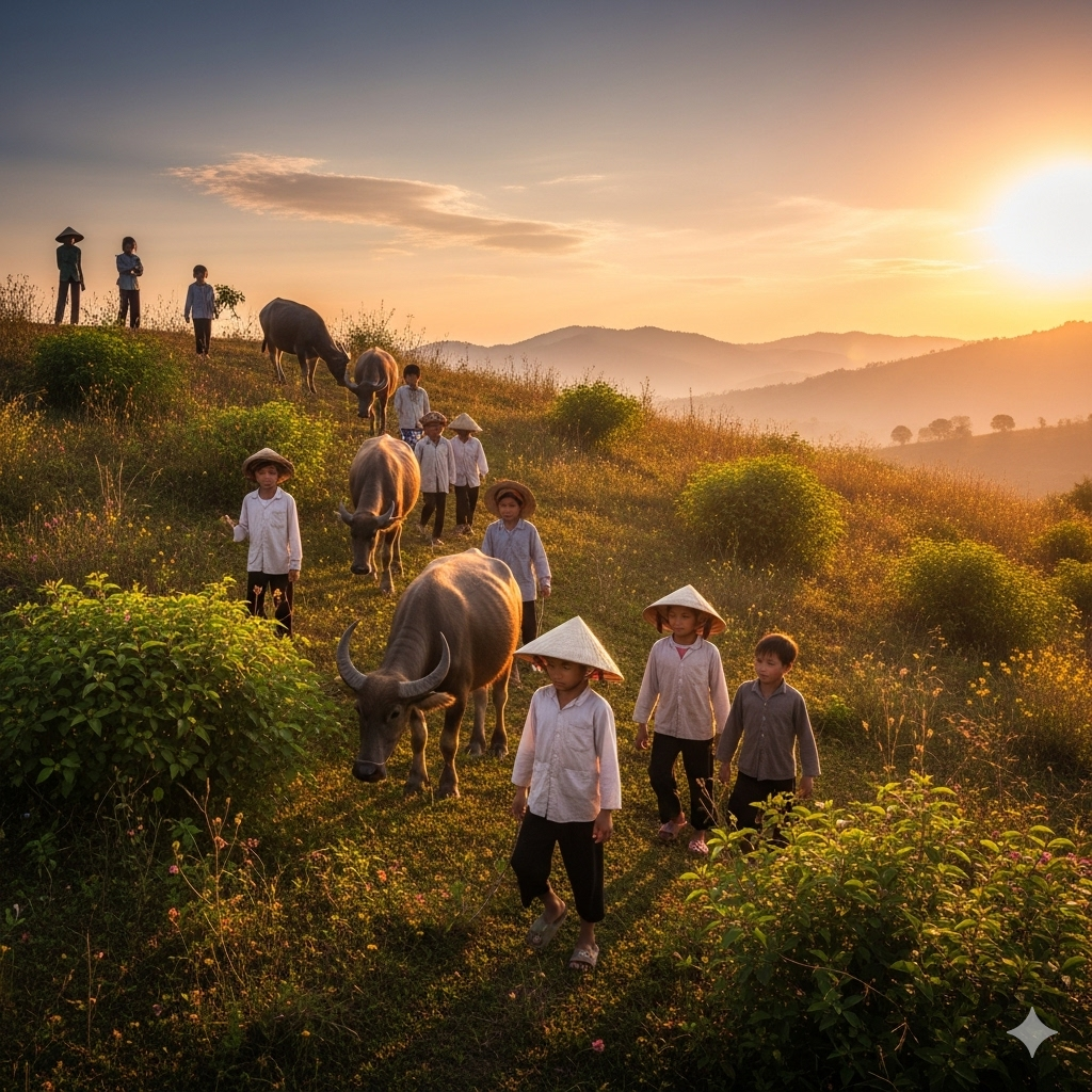 Lũ trẻ lùa bò rời cánh đồng, khi cánh đồng trong mùa trời đổ nắng đã kiệt cùng nước, kiệt cùng màu xanh cỏ. Những con bò gầy ốm được thả lên những gò đồi. Đó là những triền núi thấp lúp xúp những bụi sim, mua, ngũ sắc, dủ dẻ… Ở đó có những vạt đất trống nghiêng nghiêng cỏ. Bầy bò len mỏ qua từng lùm cây ngoặm lấy ngoặm để. Lũ trẻ chạy lăng xăng lục lọi từng bụi nhỏ hái những chùm dủ dẻ vàng ươm, những trái sim chín mọng lúc lỉu trên cành sim oằn trái. Cái nón cời ngửa ra đựng cơ hồ là những thức dâng của rừng núi. Chúng tụm năm, tụm bảy ngồi nhâm nhi vị ngọt ngào giữa tuổi thơ đầy nắng và gió. Chúng lại bày trò đếm lá. Đứa nào hái được nhiều loại lá hơn sẽ là người chiến thắng. Chúng lại bày trò trốn tìm. Có đứa nằm dẹp mình xuống ụ pháo, có đứa đu mình xuống những hố bom, dấu tích còn sót lại sau thời chiến. Tiếng cười, tiếng nói râm ran cả một vùng.