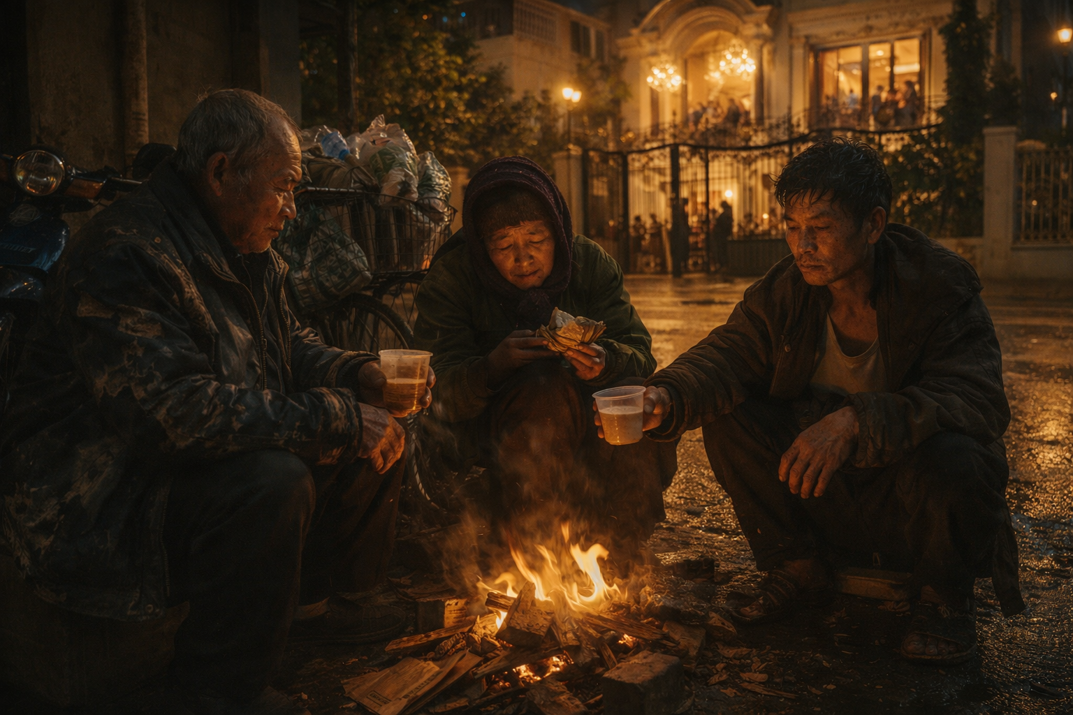 Tôi đứng dưới đèn đường. Ánh cao áp vàng vọt hắt xuống vũng nước mưa loang lổ. Bên kia đường, sau cánh cổng sắt hoa văn uốn lượn của căn biệt thự Pháp, ánh đèn chùm pha lê vẫn sáng trưng. Thấp thoáng bóng người nâng ly rượu vang đỏ. Tiếng nhạc “Happy New Year” vọng ra. Êm ái. Phù phiếm. Và xa vời vợi.