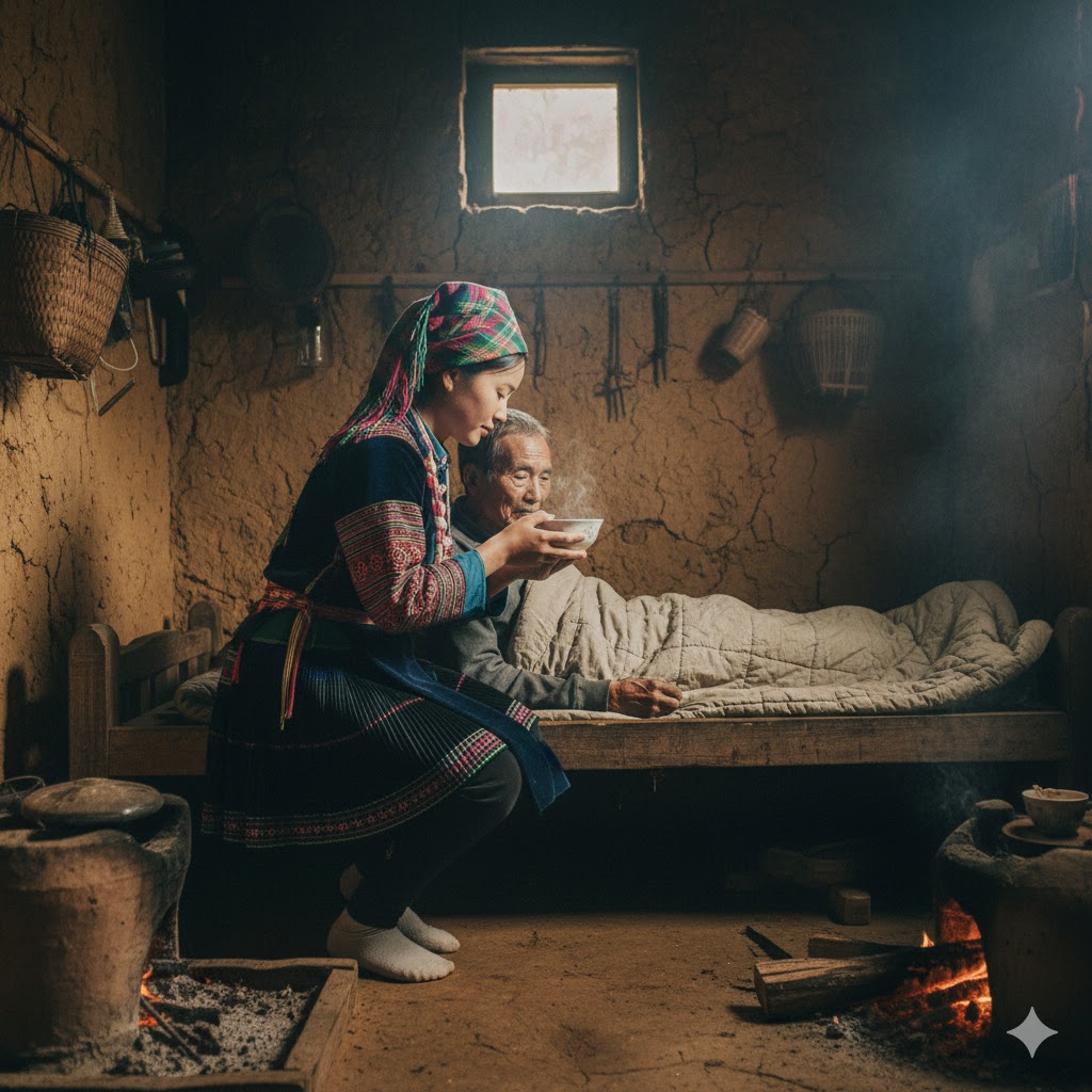 Súa đỡ người đàn ông ngồi dậy. Lưng gã dựa vào vách gỗ. Người bị thương run rẩy nâng thìa cháo, chậm rãi đưa vào miệng. Mồ hôi rịn trên trán. Mỗi cử động đều phải rất gắng gượng.