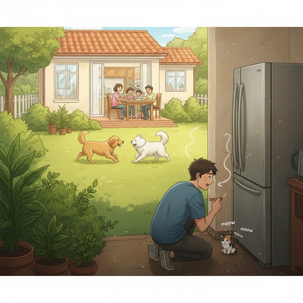 Hôm ấy, khi cả nhà đang quây quần bên mâm cơm, một tiếng “meo meo” nhỏ xíu, yếu ớt bất chợt vang lên. Âm thanh như bị nén lại, vọng ra từ khe hẹp tối tăm giữa bức tường và chiếc tủ lạnh đặt ở cuối nhà.
