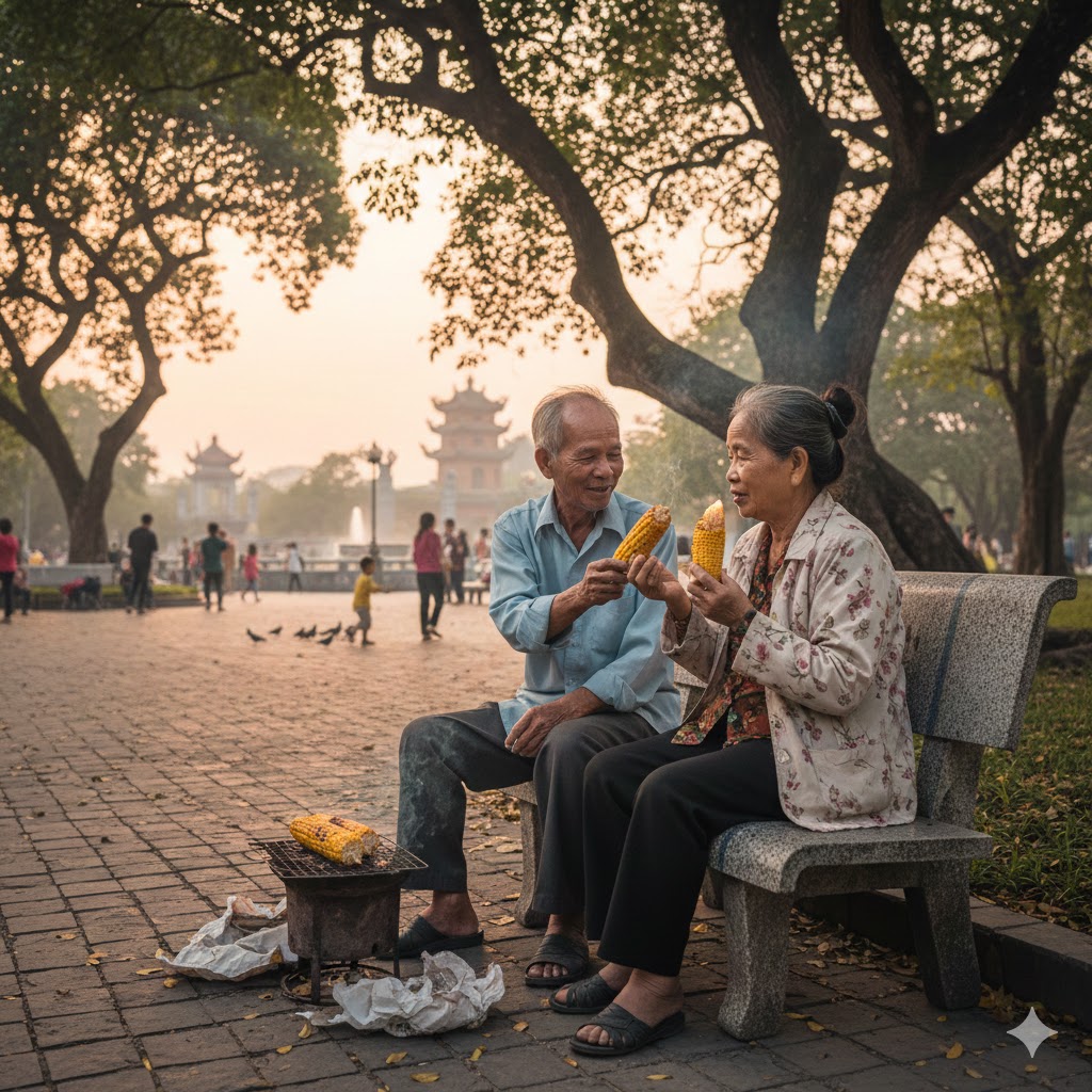 Có một hôm nọ, một cụ mang ra mấy bắp ngô nóng, chai trà ấm để mời bạn bè thưởng thức. Nhà các cụ chẳng thiếu của ngon vật lạ gì, nhưng tuổi này nhiều khi chẳng thiết ăn gì, mà cái người ta cần chỉ là cảm giác được ăn cùng với nhau. Có cụ răng yếu quá, không gặm được ngô, đành dùng tay “cấu” từng hạt ngô đưa lên miệng, nhai tỏm tẻm. Mấy cụ xung quanh cười khoái trá, có người bắt chước theo. Tiếng cười vang lên làm ấm cả một khoảng góc công viên yên tĩnh.