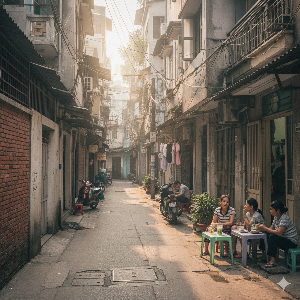 Những con ngõ dài có, ngắn có, thông suốt khắp phố này sang phường khác có mà cụt lủn một mẩu khiến người đi tìm địa chỉ phải tiu nghỉu quay xe sau khi đã vội vàng rẽ vào, cũng có. Những con ngõ đó là một kiểu “làng bê tông hóa” giữa lòng đô thị. Bởi ở đó người ta sinh sống với nhau, ngắm nghía lẫn nhau và lắng nghe biết bao màn đối thoại thầm kín của từng gia đình qua vách tường, quán nước, khoảng sân chung. Nào là anh A, chị B từ nơi khác mới về, cứ đến tối là cãi nhau, mắng con lười học. Nào là thằng bé C con ông bà D mới tí tuổi đã có người yêu rồi thì những anh chị, cô chú E, F, G v.v. khác với đủ thói quen như hát karaoke giữa trưa, bật nhạc không lời sáng sớm, đem đốt vàng mã buổi xế chiều rồi hay tụ tập nhậu nhẹt lúc đêm muộn v.v. thôi thì đủ cả. Trong ngõ chẳng ai lạ lẫm với chuyện đời tư của ai.