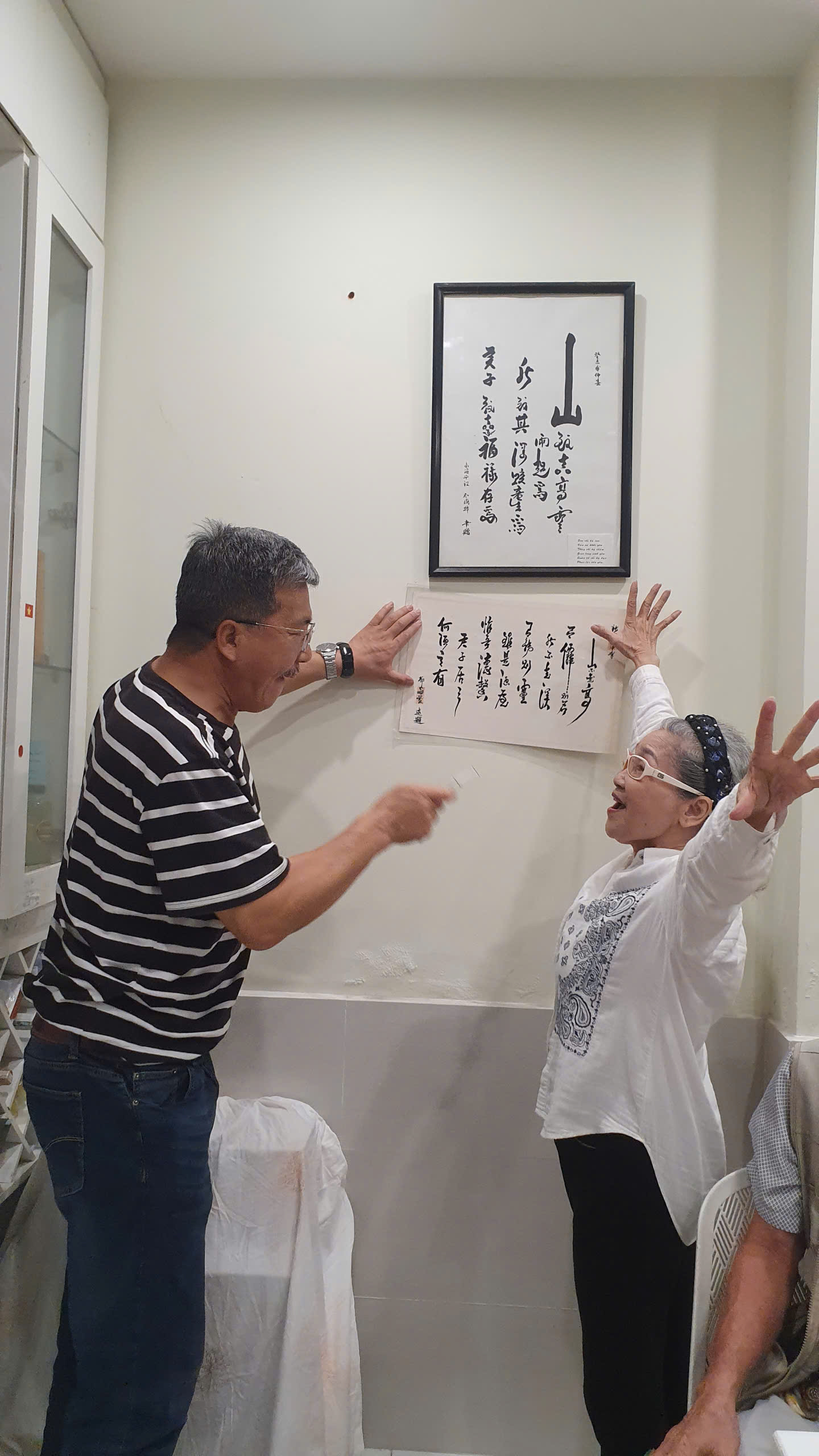 Yusuf Liu Baojun ngạc nhiên trước bức thư pháp của phụ thân nữ sĩ Đặng Nguyệt Anh treo trên tường