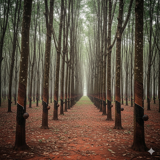 Cũng chính từ gam màu xám ấy, rừng cao su mang trong mình một nghịch lý thầm kín mà ít ai nhận ra: rễ cao su vốn nông và yếu. Có lẽ, tạo hóa ban tặng cho loài cây ấy một hình hài phản vệ trước những lỗ mãng của con người và tự nhiên. Chỉ cần một cơn bão đi qua, hàng loạt cây cao su cũng nương mình theo đổ sạp. Giữa hoang tàn, chúng nằm chồng lên nhau một cách trật tự. Không vụn vỡ ầm ào, không chống cự phản kháng. Vạn cây như một. Một thứ kỉ luật trong câm nín. Một cách sống mà vẻ đẹp nằm ở nét kìm nén ẩn nhẫn. Tổ tiên của chúng cũng đã gục xuống cách đây hàng ngàn năm trước, lấy phục tùng là tôn chỉ, nghi lễ là đầu hàng. Và giờ đây chúng cũng nghiễm nhiên kế thừa cái di sản ấy, không phải trong dáng hình những truyền nhân bất đắc dĩ, mà là những môn đồ thuần phục và lặng lẽ.