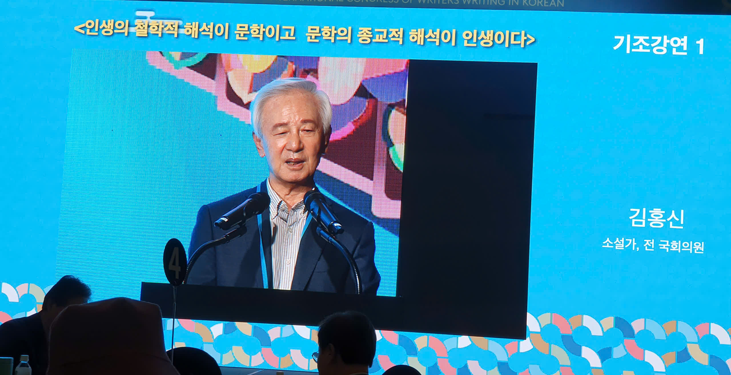 Với nhan đề giàu tính gợi mở: “Văn học giải thích tính triết học và tính tôn giáo về cuộc sống”, nhà tiểu thuyết gia, nguyên Nghị sĩ Quốc hội Kim Hong Shin đã mở đầu buổi tham luận bằng một tuyên ngôn mạnh mẽ về sức mạnh và tinh thần bất diệt của văn học. Ông không ngần ngại chỉ ra sự yếu đuối mong manh của con người, “thua cả muỗi”, nhưng chính trong sự yếu đuối ấy, văn học xuất hiện như một nguồn sống, nơi tình yêu, sự quan tâm, sự tự hào và chia sẻ được nuôi dưỡng.