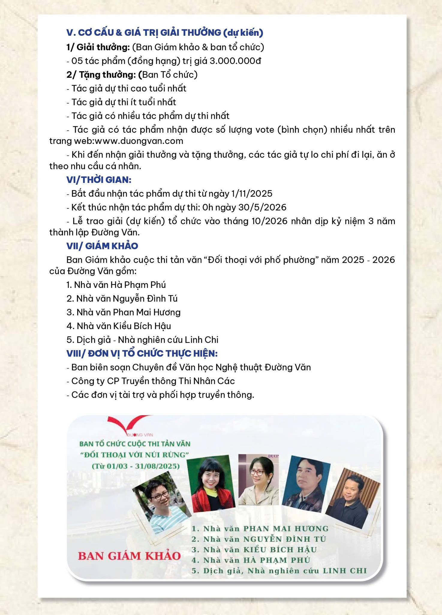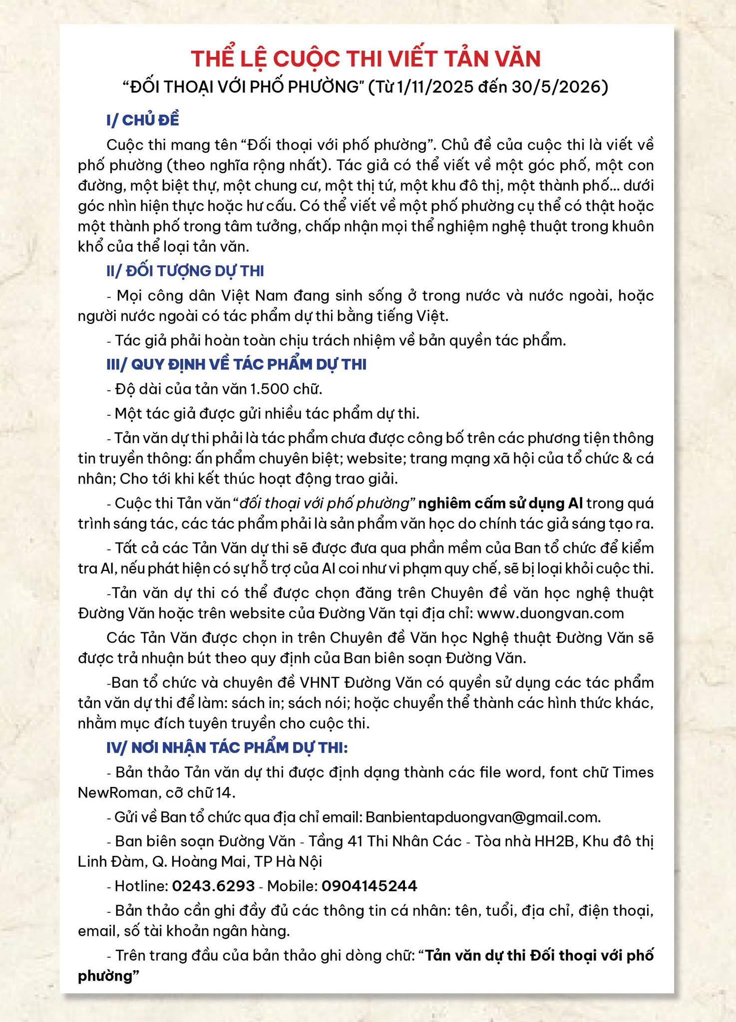 -Tản văn dự thi có thể được chọn đăng trên Chuyên đề văn học nghệ thuật Đường Văn hoặc trên website của Đường Văn tại địa chỉ: www.duongvan.com