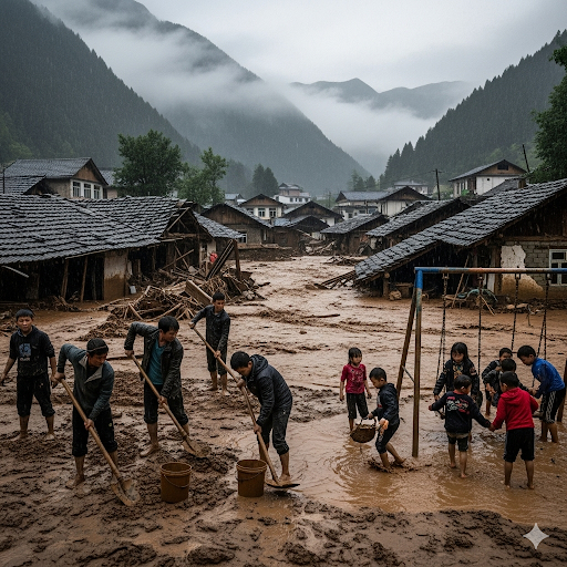 Tôi ngồi nghe dân bản kể lại về cơn lũ trong đêm. Trong làn mưa, tôi nhìn thấy đôi mắt trẻ thơ sáng lên như cậu học trò của tôi ngày nào vượt mưa từ bản lên xã để học. Niềm tin trong những đôi mắt nhỏ của bản. Cơn lũ quần nát mọi thứ trên đường đi của nó. Bùn đất nhão nhoét ở mọi nơi. Những khúc gỗ, những tấm ván nhà nằm chỏng chơ, nhọn hoắt. Con suối trong veo ngày nào giờ đỏ ngầu bùn đất. Nơi từng yên bình nay chỉ còn lặng lẽ và xót xa. Nhưng chính trong đổ nát ấy, tôi lại thấy sức mạnh lạ lùng của con người nơi đây. Đôi bàn tay vẫn nắm lấy nhau, ánh mắt vẫn cương nghị, và vẫn đó niềm tin vào con người, vào rừng núi. Người đàn ông cần mẫn kéo bùn ra khỏi những ngôi nhà gỗ của mình, đã sập. Người phụ nữ ngồi trong lán tạm, bên bếp, hong quần áo ướt. Trẻ con ríu rít chạy quanh, quần áo ướt sũng, lấm lem bùn, ánh mắt hóng người lạ. Những người già ngồi nhìn cảnh tan hoang trong tiếng thở dài, dồn nén. Háng Pu Xi!