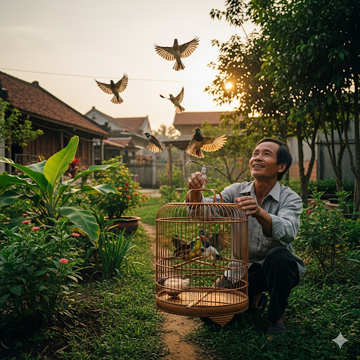 Chiều nhạt nắng, vợ chồng gã đưa con về nhà. Ở viện với con mấy hôm, tự dưng gã có cảm giác lạ lẫm cả với khoảnh vườn nhỏ của mình. Mấy chiếc lồng lủng lẳng khô khốc, lũ chim xơ xác, mắt ngơ ngác như những vì sao lạc. Gã bần thần nhìn chúng rồi rút soạt cái cửa lồng, động tác dứt khoát hơn cả lúc bấm công tắc bẫy điện. Có con bay vút lên, có con loạng choạng sà xuống thấp rồi cũng cố sức vẫy vùng chấp chới bay lên đậu trên cành nhãn. Quay đầu nhìn về phía góc hiên, gã không thấy chiếc bẫy điện của mình đâu nữa. Gã nén lòng thở ra nhè nhẹ. Trong nhà, mùi nhang trầm thoang thoảng mênh mang, bà mẹ già ngồi dưới ban thờ, tiếng gõ mõ tụng kinh đều đều cất lên trong chiều chạng vạng.